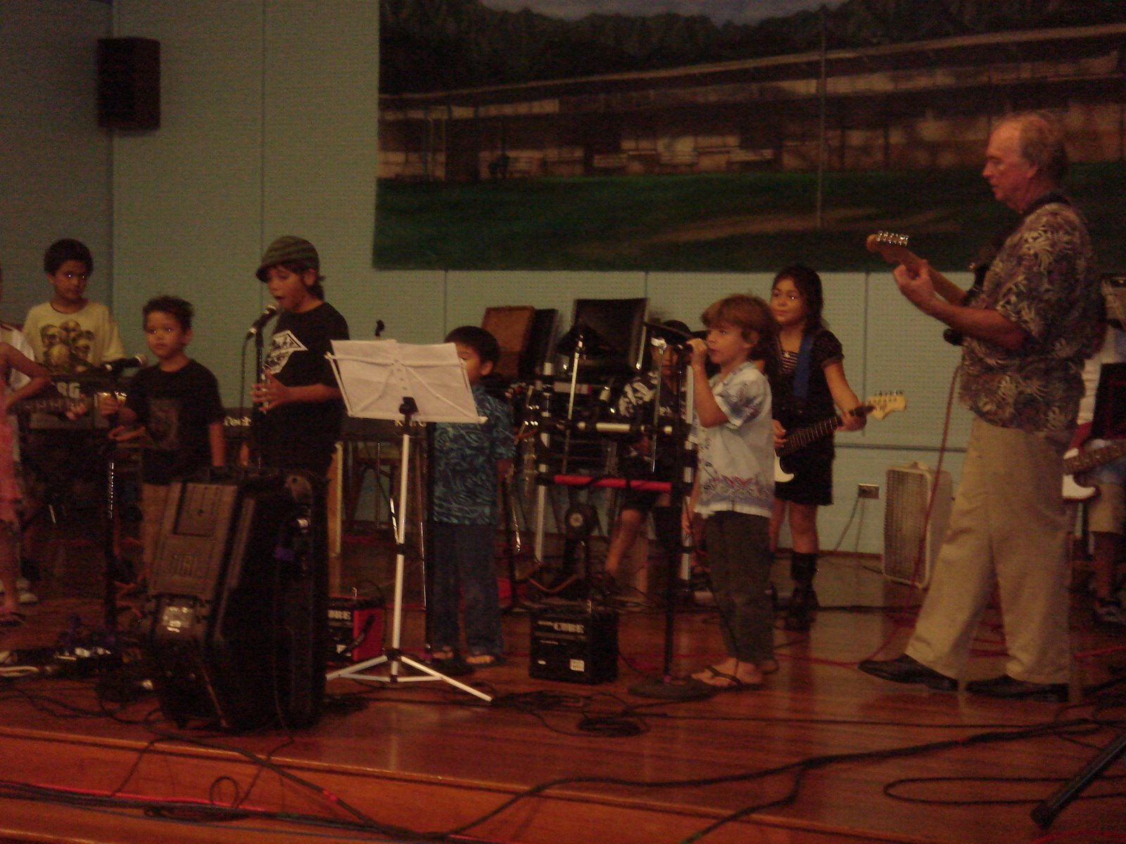 For several months now Tanner has expressed an interest in guitar lessons. I finally went and did some research to see what was out there and found a guy in Kaneohe who teaches lessons at his own "School of Rock". Much like the movie, he has a bunch of kids starting at around Tanner's age up to adults that he teaches Guitar, Keyboard, Drums, and vocals to. It's hystercial to watch them play together and while most of the songs are just barely recognisable yet, the kids really have a blast. At the end of each session, Brian (the teacher) hosts a rock concert for the kids to show off their progress and ham it up a bit. Since Tanner started late in the last session, he only participated in vocals for one of the song's, Blue Sude Shoes, but he did really well and actually remembered most of the lyrics. Hopefully, for the next concert in February, he'll be on an instrument as well.